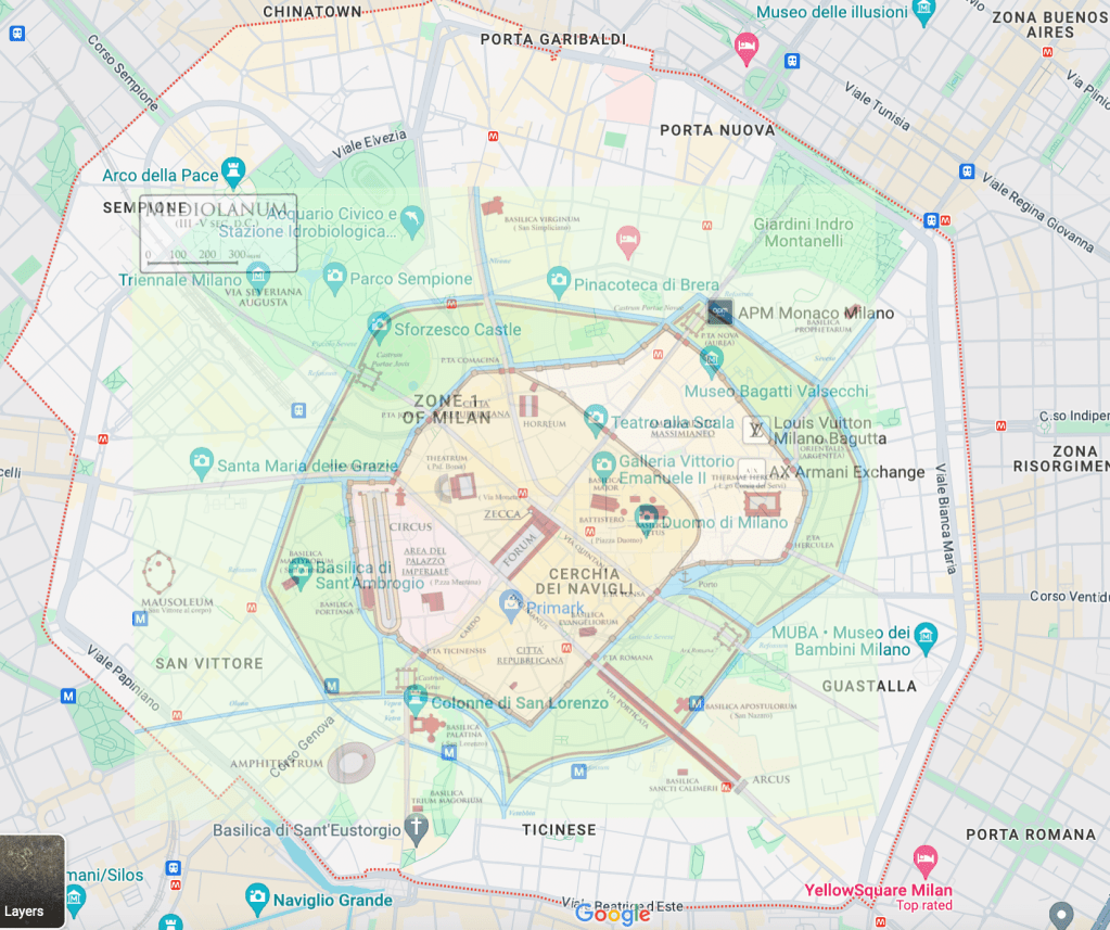 Here is a map that I have created superimposing a map of Mediolanum from the 3rd to the 5th centuries upon a modern-day map of Zone One of Milan.