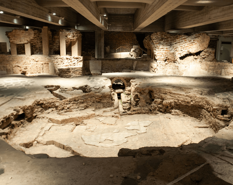 The vast majority of the basilicas and churches in the city tended to fall within these boundaries, which makes sense considering the history of major basilica and church construction in the paleochristian period. This includes the four Ambrosian churches (the three that still remain in the city: Basilica di Sant’Ambrogio, Basilica di San Simpliciano, and Basilica di San Nazaro in Brolo), other early churches like Basilica di San Lorenzo and Basilica di San Calimero. These basilicas appear in the map that I have created, below, that triple superimposes a map of Roman Mediolanum from the 3rd to the 5th centuries, important historical sites from Roman Mediolanum like the Roman Forum, Circus, and Imperial Palace, and a current map of Zone One of Milan.