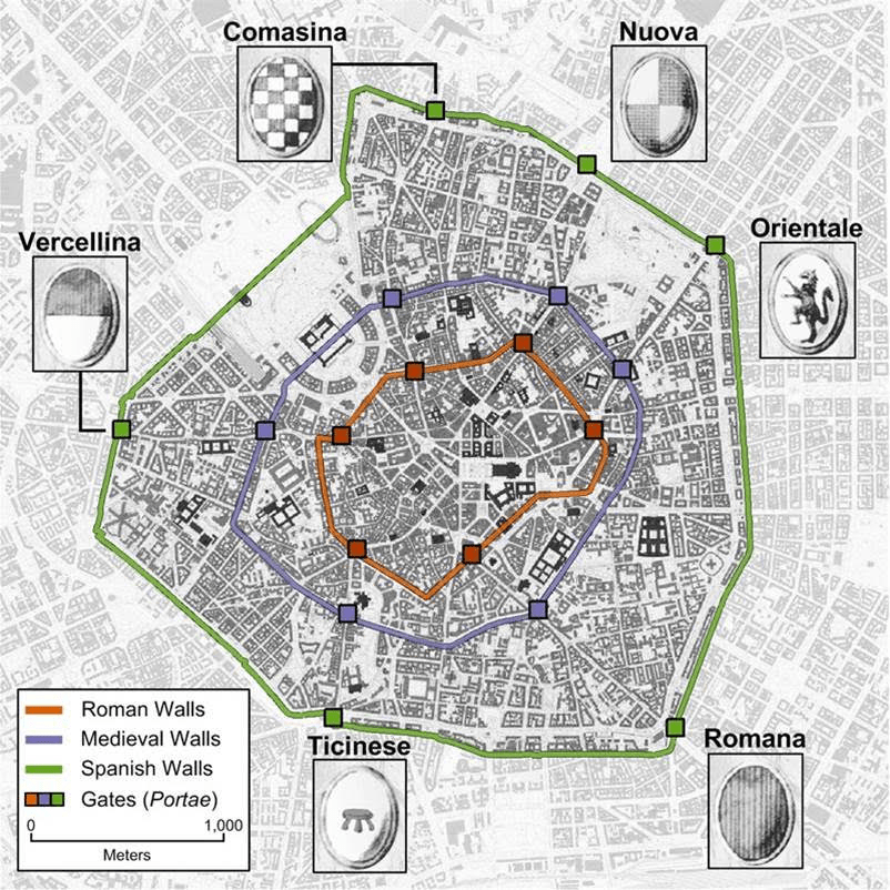 Below is a map of Mediolanum as the city and its borders evolved historically. The walls of the city had six main gates: “Porta Romana,” “Porta Ticinese,” “Porta Vercellina,” “Porta Orientale,” “Porta Jovia,” and “Porta Cumana.” “Porta Romana” and “Porta Ticinese” are now used interchangeably to refer to later systems of city walls (such as the Spanish walls), and the remains of these systems remain throughout parts of the city. The wall systems and boundaries differentiate different time periods and reigns, such as the Roman, Medieval, and Spanish walls enforcing the city.